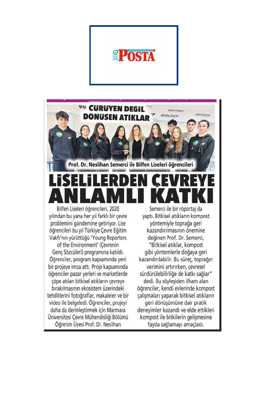 Bilfen Liseleri Öğrencilerinden Çevreye Anlamlı Katkı